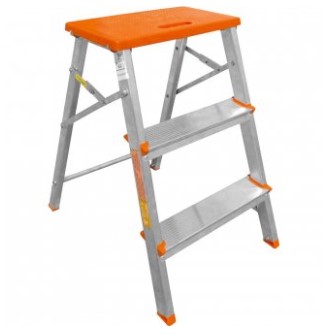 Escada tipo banqueta, estrutura e degraus em alumínio, patamar de polipropileno de alta resistência com alça para facilitar o transporte. Pés com parafusos antiqueda.