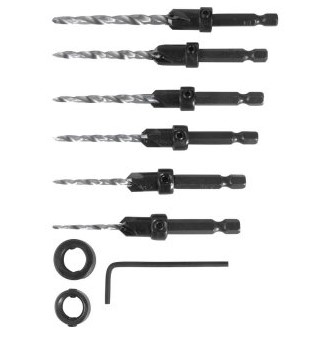 1 Jogo de brocas com escareador, sendo: 1 escareador de 4,0 mm com broca de 7/64 (2,8 mm), 1 escareador de 6,0 mm com broca de 9/64 (3,6 mm), 1 escareador de 8,0 mm com broca de 11/64 (4,4 mm), 1 escareador de 10,0 mm com broca de 3/16 (4,8 mm), 1 escareador de 12,0 mm com broca de 7/32 (5,6 mm), 1 escareador de 14,0 mm com broca de 1/4 (6,4 mm) e 2 batentes/limitadores de profundidade ajustáveis.