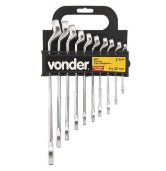 1 Jogo de chaves combinadas, composto por um suporte plástico com 10 peças, sendo: 6 mm, 8 mm, 10 mm, 11 mm, 12 mm, 13 mm, 14 mm, 17 mm, 19 mm e 22 mm.